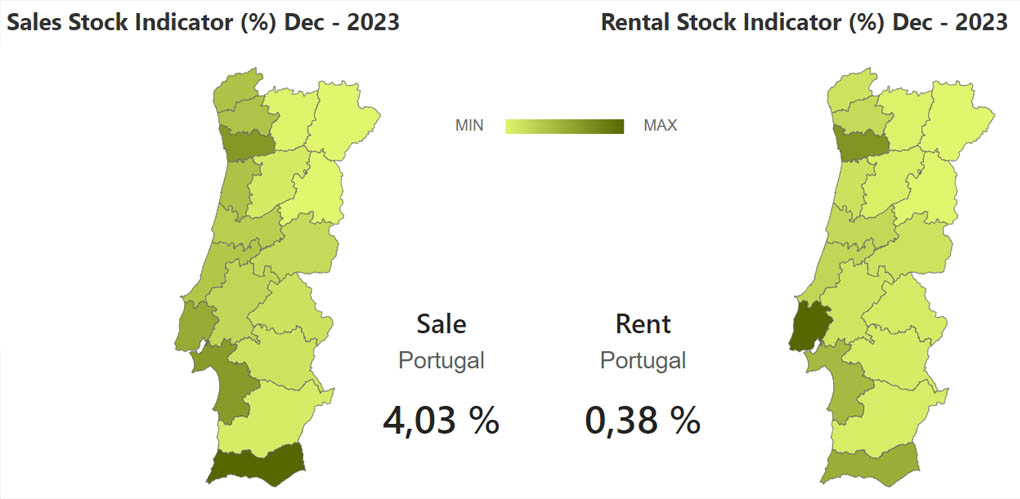 The available housing stock for sale was 4.03% in December 2023, while the rental stock was 0.38% in relation to the total existing housing stock in Portugal.